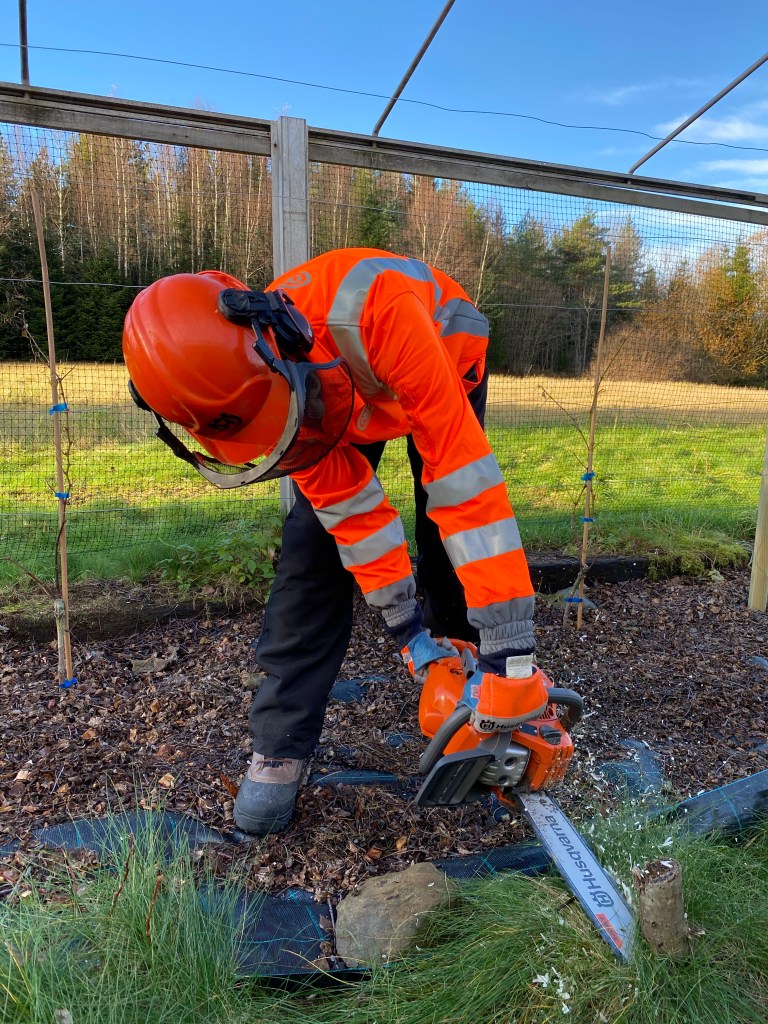 Staur og ståltråd må settes opp, slik at alt er klart til oppbinding når drueplantene skyter fart til sommeren. Da kan de utvikle seg til frodige ranker når de blir større. Gamle stubber som står innimellom, må skjæres ned slik at plantene får bedre plass.