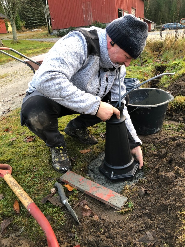 Og fordi det stunder mot vinter og mørketid, har vi gravd ned mange meter med jordkabel, slik at vi kan montere mere utelys. Siden bolighuset ligger litt fra gårdstunet, er det greit å få lyst opp veien slik at vi slipper å «kræsje» med elgene!