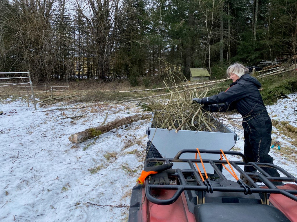 Samtidig har vi god utnyttelse av hogsten. Trestammene kapper vi til ved. Grenene maler vi opp til flis, som så benyttes i gangstiene i grønnsaksfeltene.