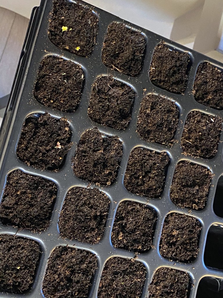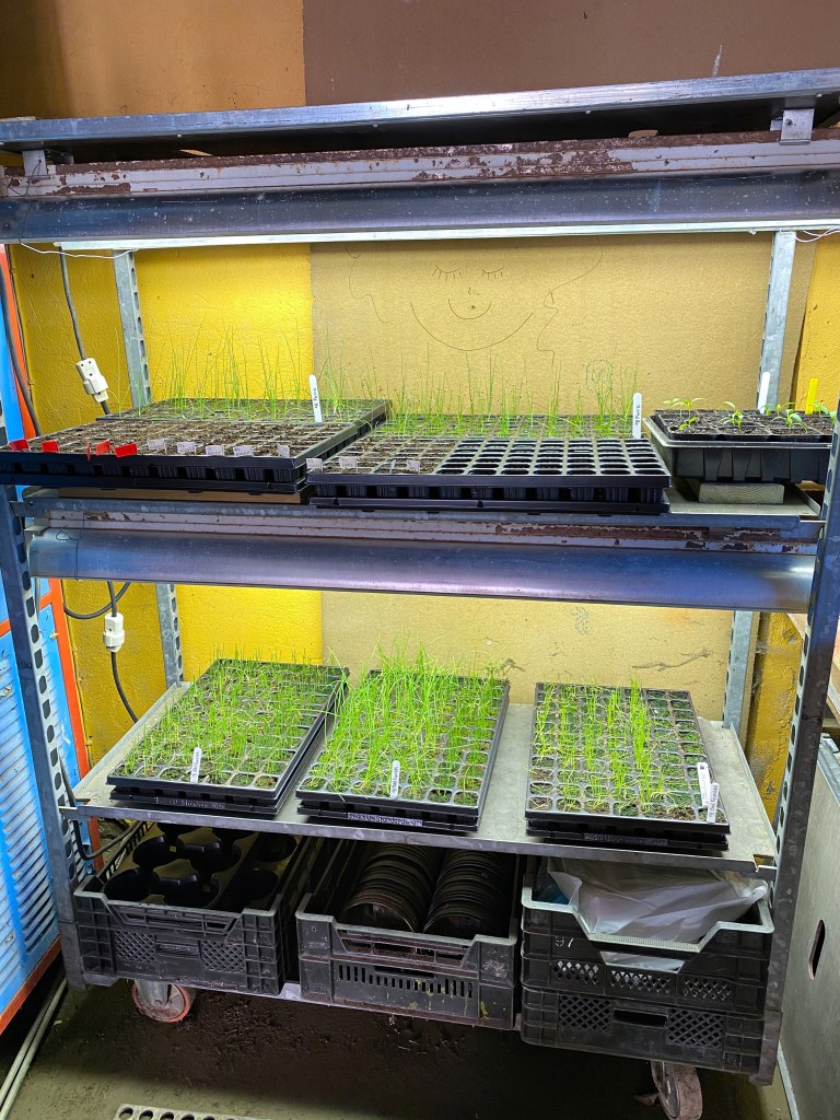 Mye av frøene er blitt sådd i potter og satt under lys inne i bolighuset, men nå var tiden kommet til å flytte de ut i det veksthuset.