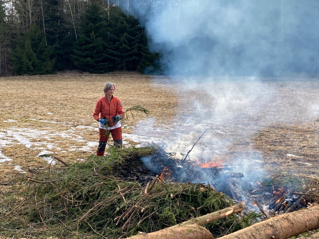 Tømmer og kvist har dekket store deler av området, og derfor har denne helgen gått med til å rydde opp og kappe stokker til passelige vedlengder. Kvist og kvast ble brent opp i et gedigent St. Hansbål…