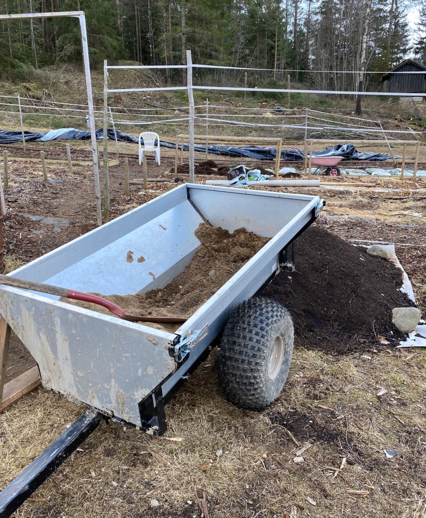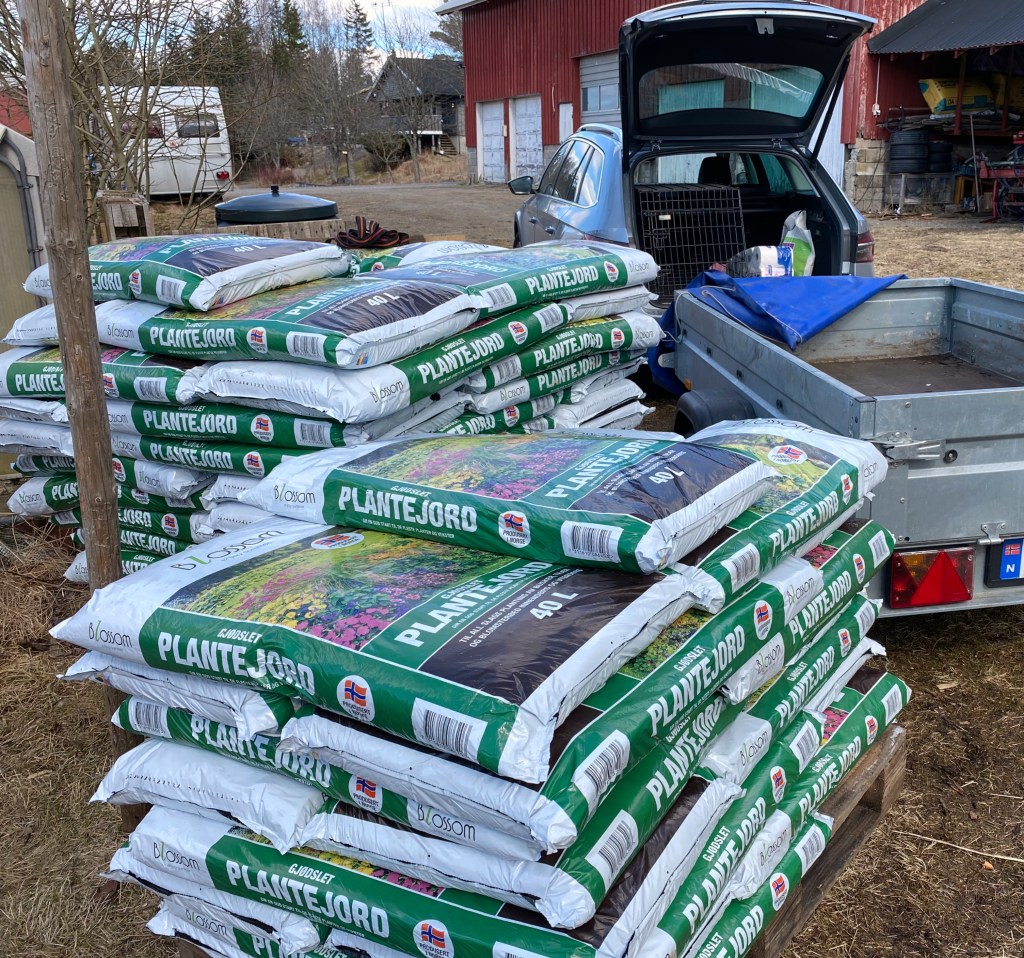 Noen av såbeda må også ha tilført mer jord og næring. For å slippe ugress valgte vi derfor å kjøpe inn to paller med ferdig gjødslet plantejord. I tillegg har vi tidligere i år kjøpt inn kompostjord, så dette burde bli bra miks for gulrøttene.
