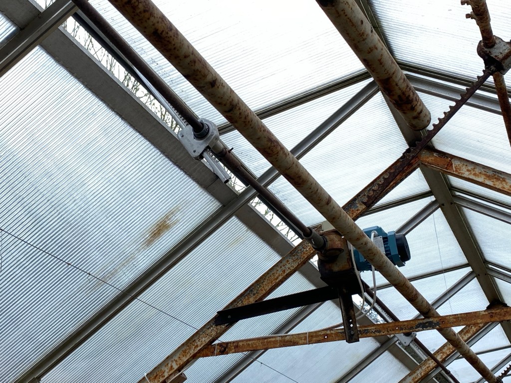 Veksthuset vårt er utstyrt med et styringssystem som automatisk åpner og lukker lukene ved innstilte temperaturer.