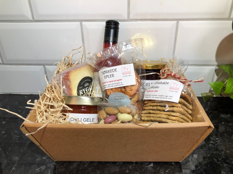 Julekurven vil inneholde Hovden Gård’s Ripsgele, Chili Gelé, Tørkede Epleringer og Hjemmebakte kjeks, i tillegg til lagringsost fra Rygge Meieri, Eplemost m/ Bringebær (Dyre Gård i Moss) og Sjokoladekuler fra Grini Gårdsbakeri. Kurven pakkes inn med Cellofan og Julebånd og passer ypperlig som julegave. Prisen er kr. 400,- og den kan bestilles allerede nå og hentes fra nå og fram til Jul.