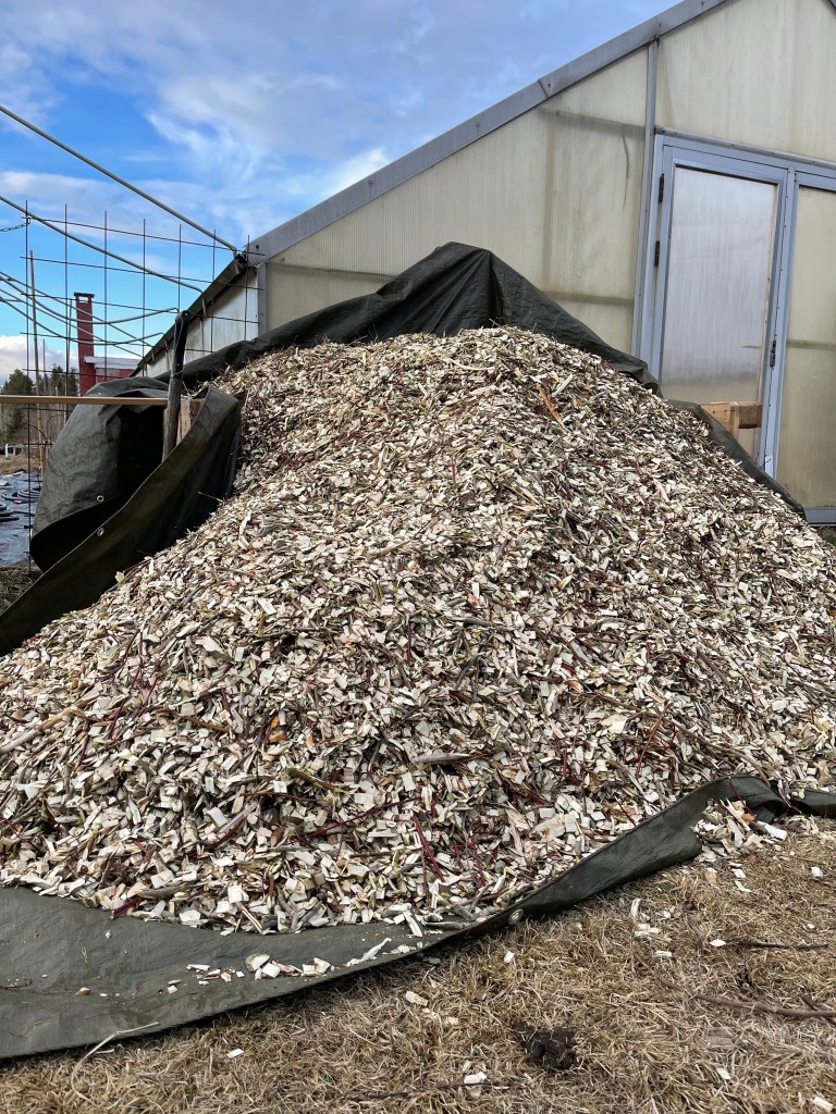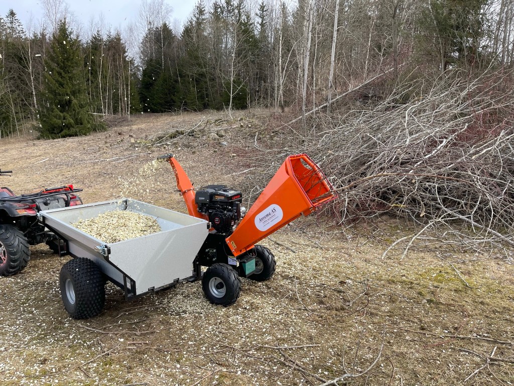 Kvisten tar vi vare på og hugger opp til flis, som igjen blir lagt i gangstiene mellom grønnsaksbedene.