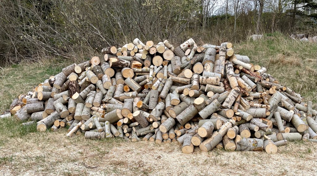 Siden vi ikke har vedmaskin men kapper stokkene med motorsag, tar det tid. Alt for lang tid synes vi.