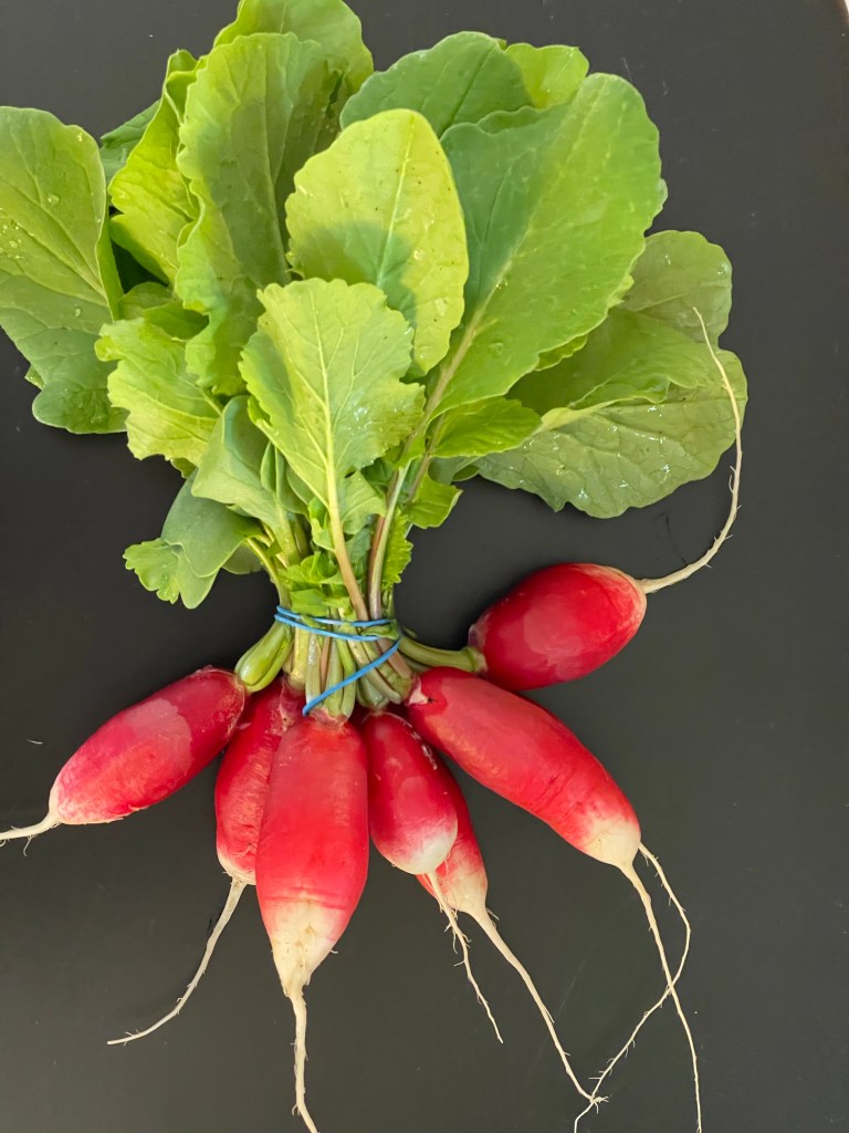 Også ruccola og store, nydelige reddiker er klare for levering.