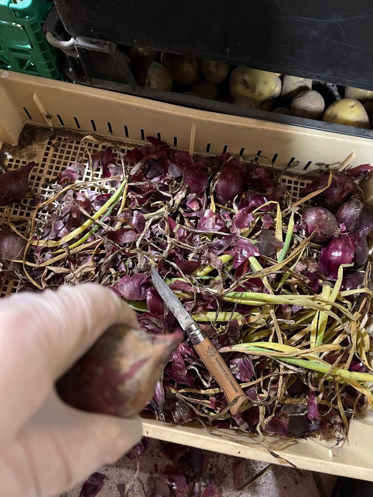 Både rødløk og gulløk er høstet inn, men de må pusses før pakking og levering. Derfor var vi i gang allerede kl 06.00 denne lørdagen.