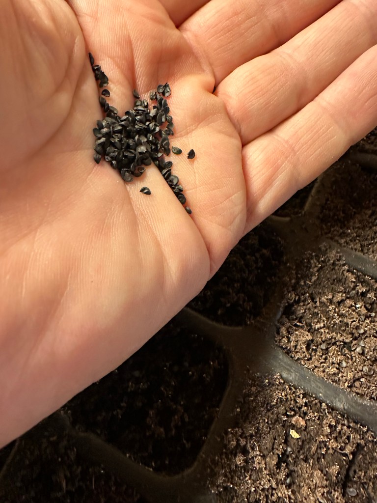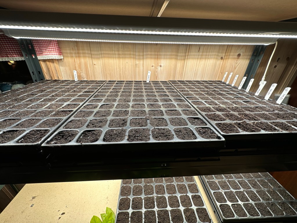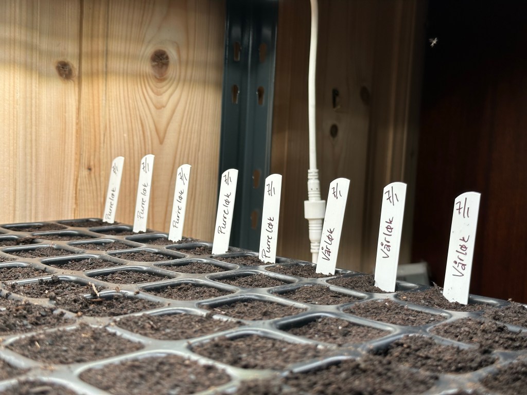 Foreløpig er det løk av forskjellig valør samt paprika og chili som er sådd, og plassert under plantelys.