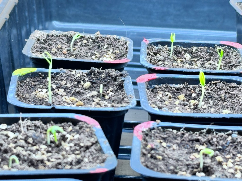 Sesongen startet for to uker siden. Først ut var chili og paprikafrøene. De har allerede begynt å spire, og står nå under plantelys.