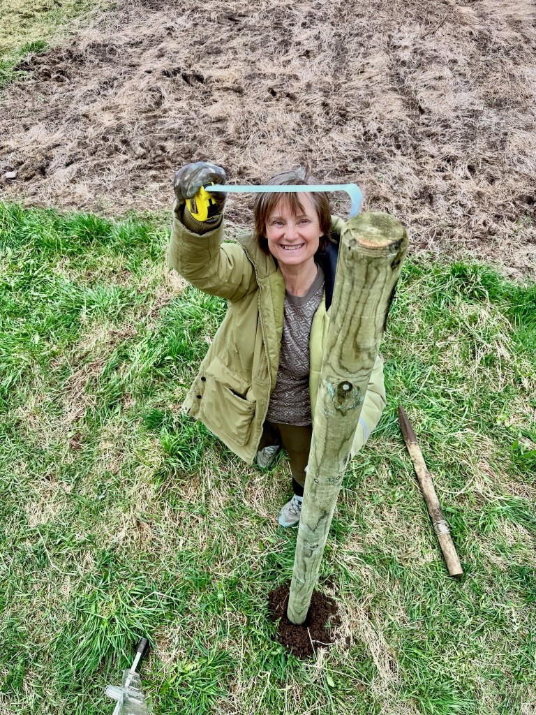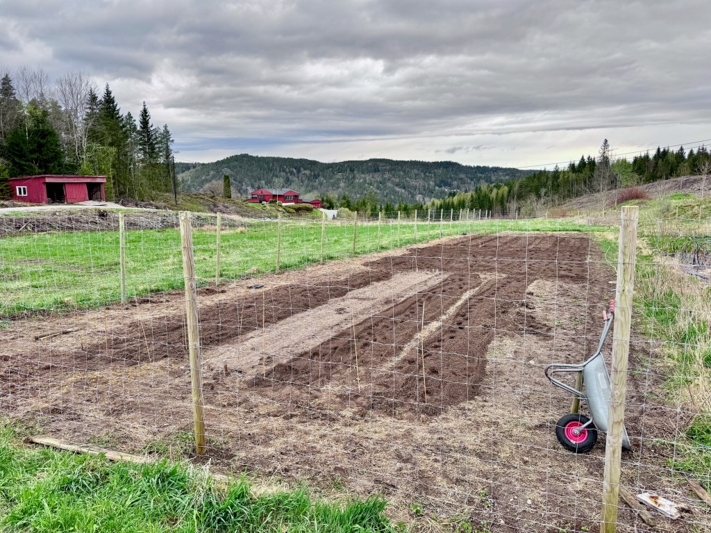 Når våren kommer blir feltet frest opp med tohjulstraktor med bedfres – og dermed etableres bed for utplanting. Og så gjerder vi. Meter på meter med viltgjerde for å holde elg og rådyr unna 😀
