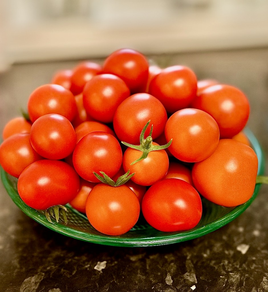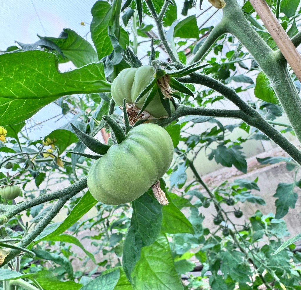 De første tomatene er allerede høstet. Som vanlig er det de små søte Zuckertraube som er først i køen. Agurkene kommer for fullt, og salaten er nå på sitt beste.