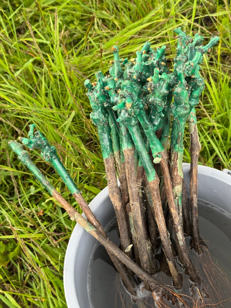 Samtidig hentet vi 200 nye druestokker i Sandefjord, og disse måtte plantes innen få uker. Inngjerding, pussing av enga og boring av 200 hull på 20cm x 60cm tok tid!