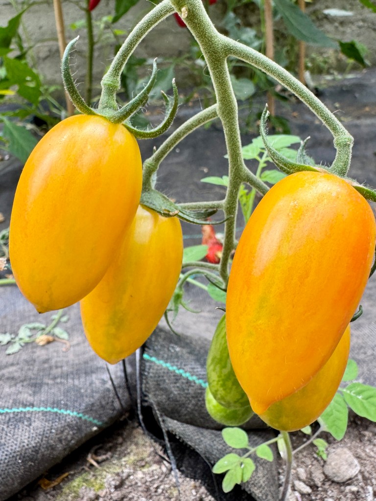 Akkurat nå har vi masse tomater og agurker, og spesielt populært er det å plukke tomatene selv. De ulike sortene har samme kilopris, og vi ser at de fleste velger å blande flere sorter i kurven. Hver sort har sine spesifikke egenskaper, smak og utseende.