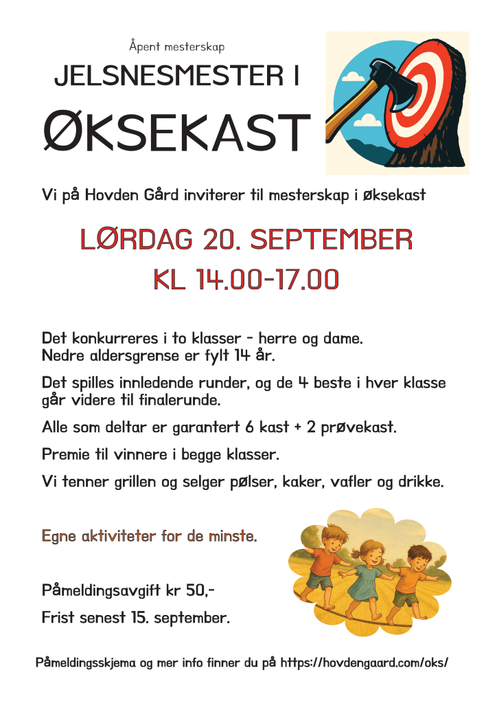Vi ønsker å bidra til å skape mer aktivitet i bygda, og inviterer derfor til åpent Jelsnesmesterskap i øksekast lørdag 20. september kl 14.00-17.00. Vi har samme øks og blink som på Farmen, så nå er det ingen unnskyldning for å vise at man er bedre enn TV-kjendisene.