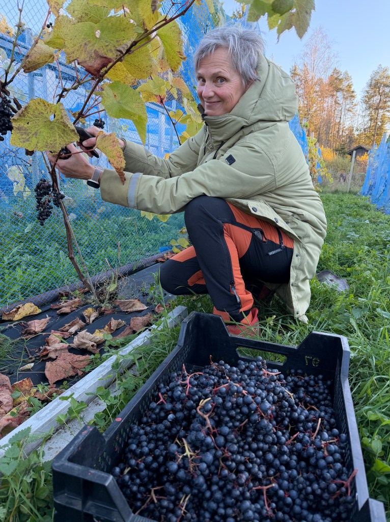 Da er årets druer høstet og kvernet og satt til gjæring. I år har det vært et godt drueår. Mange soldager og mye varme har resultert i gode avlinger. Dessverre spiste trost og stær opp halvparten av druene. Vi dekket plantene med bærnett, men jommen hadde de klart å komme seg inn under nettet på 3 av 6 rader. Med andre ord – de spiste rubb og rake på 45 planter. Det er nyttig lærdom.
